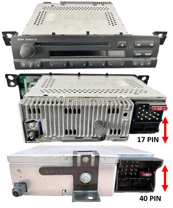 Wichtig ist die richtige Auswahl des Radioadapters, da der BMW E46 entweder einen 17-PIN- oder 40-PIN-Anschluss besitzt.